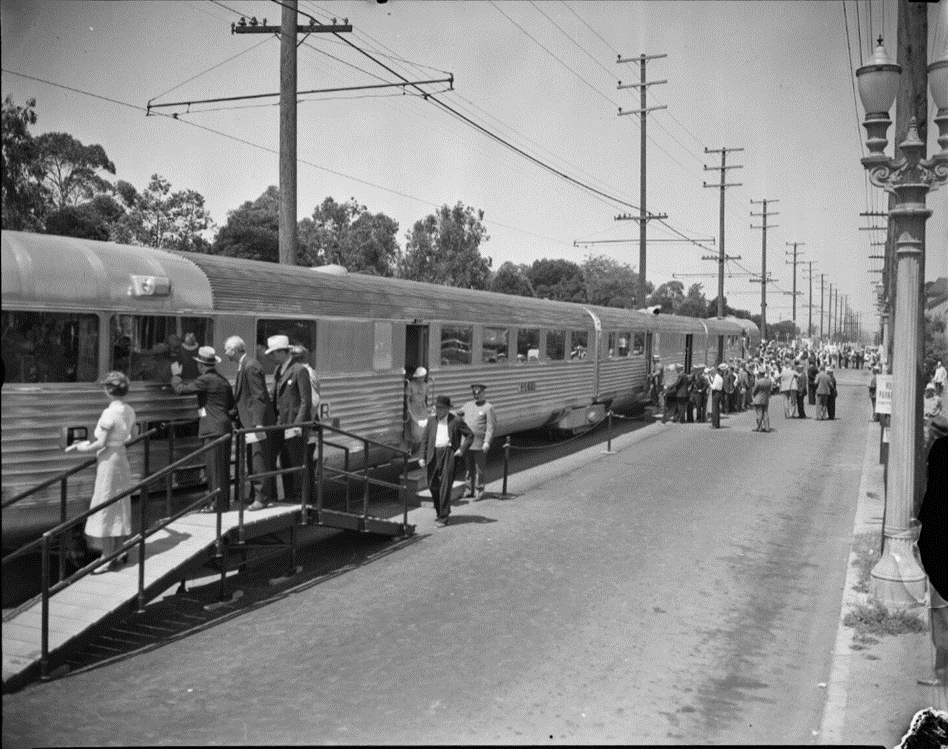 Burlington Zephyr In Los Angeles A photo from the UCLA Digital Library. Description: Attendees view the Burlington Zephyr train at Exposition Park, Los Angeles, 1934 Bob Chaparro Hemet, CA _._,_._,_