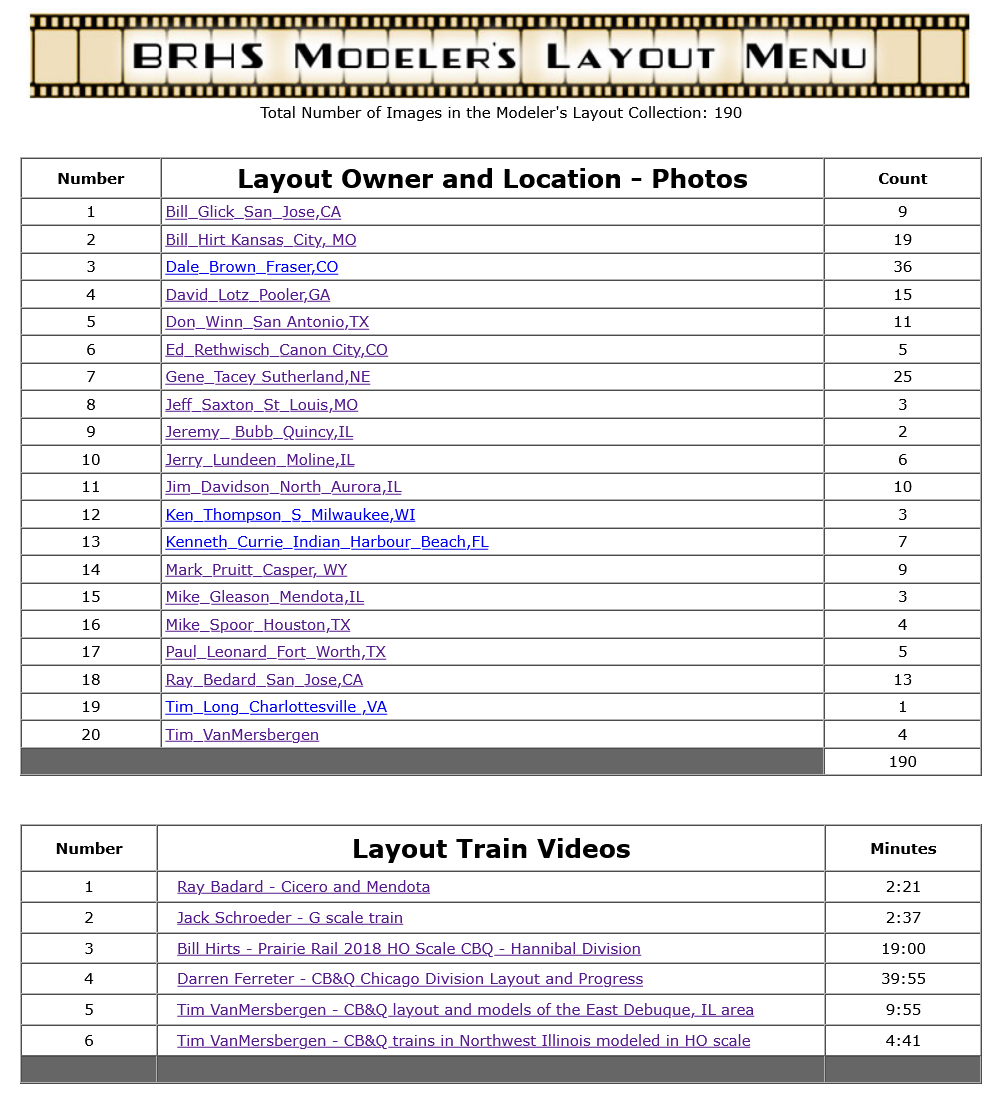 Below is a list of members who have submitting photos of their model layout. There are a total of 190 photos and 6 videos. This is a great feature that shares the modeling skills and hard work of more then 1,000 BRHS members. This feature may inspire others or plant ideas in the minds of other members for stuff they might do. Do you have a model layout that is not featured here? If so, I would ask that you grab your camera and take some photos and share your layout here. Send them to me and I will get them on-board.  Thanks.Â