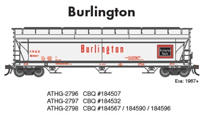 Athearn has announced that they are doing a “rerun” of the 4600 cu. ft. Center Flo hoppers in CB&Q paint. Thers cars are accurate for the Q & the FW&D LO-8a.