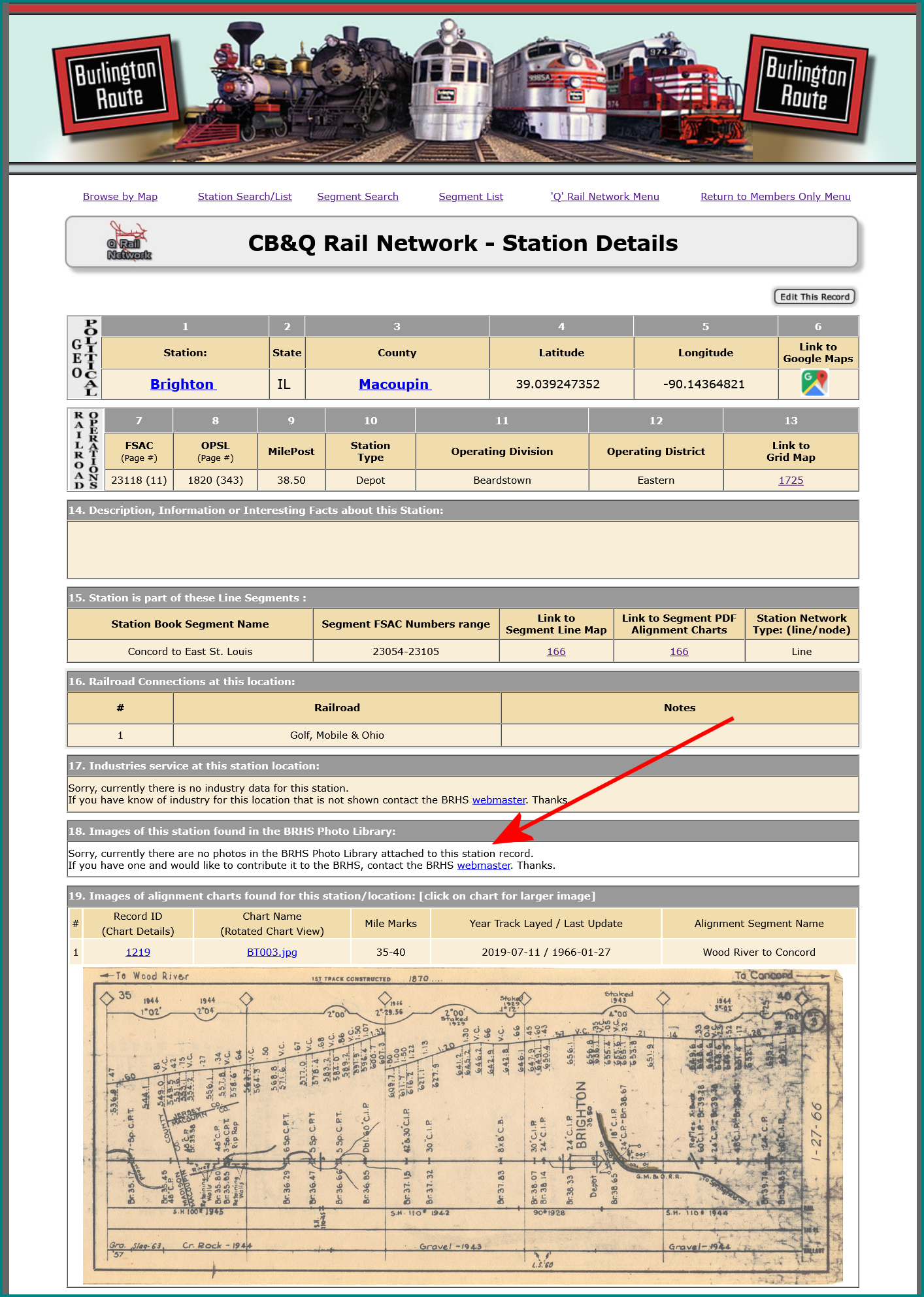 Sorry - no photos. The BRHS has 1,977 station records like this one in it's Members Only section, and 4,243 photos of stations, but not one of Brighton, IL. If you find one or if anyone has one, please consider sending to the BRHS. \Maps of line segment number 166, which Brighton is located on, are shown below. Line segments are based upon the CB&Q 1968 station directory. ![]() You can purchase a copy of the 1957 CB&Q station book from eBay for $30 or you can Join BRHS and see it and 5 others on-line. If you would like to have access to this and much more CB&Q information, you can join BRHS for just $40/ year... cheep for what you get. JOIN On 11/7/2025 10:24 AM, Lawrence Thomas