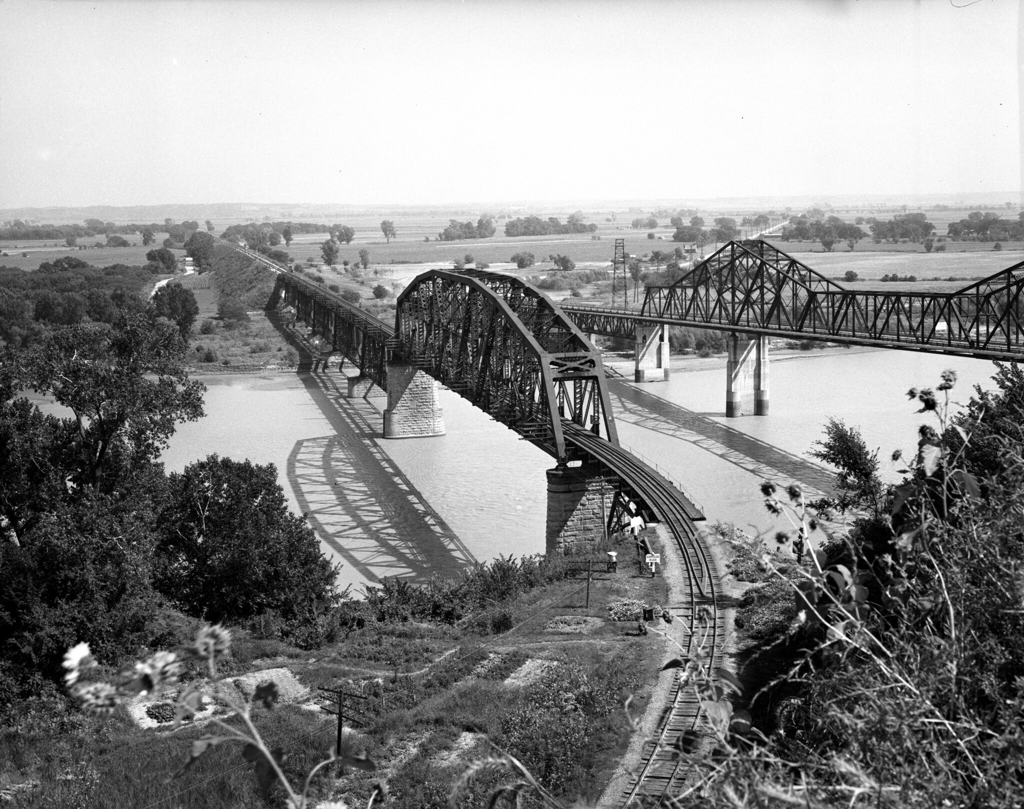 After reading Glen's message 67924 and Dave's message below, I compared the image in question, to an image I just posted to SmugMug (below) from 9/44 of the bridge crossing the Missouri at Plattsmouth. As Glen points out, both sides of the bridge had changed, but the the piers and the approach looks identical between the two pictures. I think we can label this as the original bridge at Plattsmouth, as Dave and Glen state. Agreed? Rich