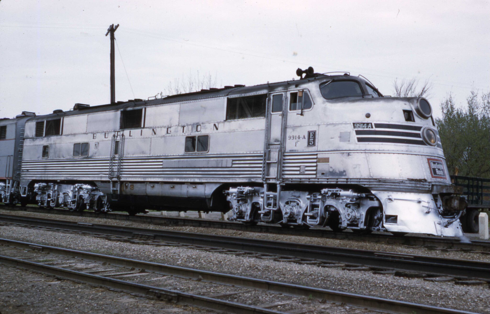 1963: E5A 9915A is wrecked at Bigelow, MO on 4/22/63. It remains on the CB&Q roster until traded in to GE in March 1965 for U25B's