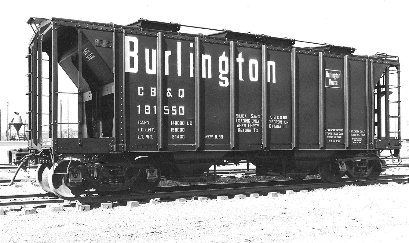 CB&Q Hopper 181550 A post by Stamey on the Facebook Classic Freight Car Fans From Beginning To 1970 Pictorial group. Description: CB&Q 181550. Kent Charles collection My Notes: Built in 1958. From Series 180000-189999. 1,942 cars in service per the January 1965 Equipment Register. Silica sand loading. There is an equipment trust plate on the upper left corner of the car. Bob Chaparro Hemet, CA